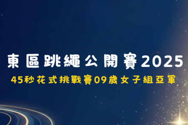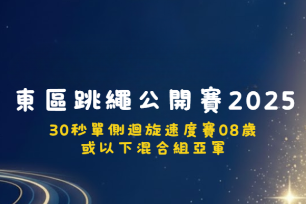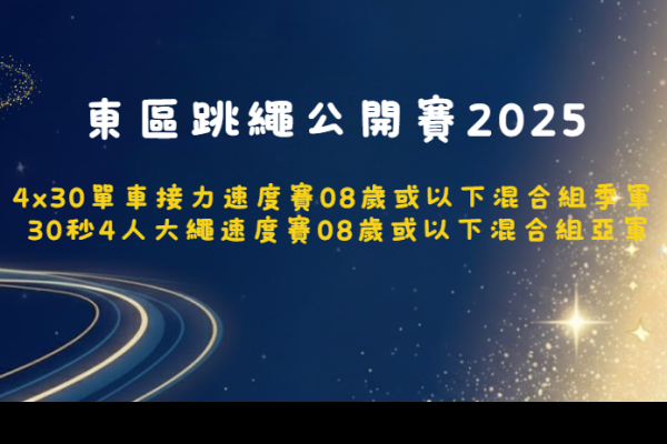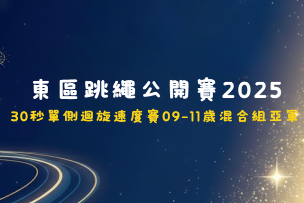 慶祝中華人民共和國成立75周年 東區跳繩公開賽2024 | 4x30單車接力速度賽【東區】9-11歲女子組 亞軍 4x30單車接力速度賽【東區】9-11歲女子組 季軍 4x30單車接力速度賽【東區】8歲或以下混合組 亞軍 30秒4人大繩速度賽【東區】8歲或以下公開組 冠軍 30秒4人大繩速度賽【東區】9-11歲公開組 冠軍 30秒單側迴旋速度賽【東區】9-11歲女子組 季軍 30秒前繩速度挑戰賽【東區】7歲女子組 冠軍 30秒前繩速度挑戰賽【東區】11歲女子組 冠軍 |